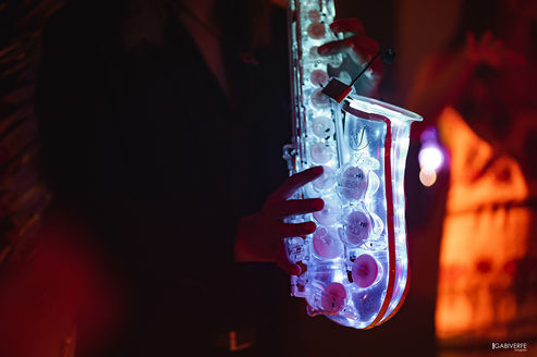 Com seu estilo único e um saxofone iluminado, desenvolve uma maneira própria de atuar e interagir enquanto toca. Sua energia é contagiante e extremamente divertida.